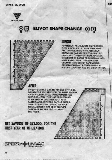I got a pat on the back for this idea, drafting was quite willing to help implement and document the idea in a submittal. As I recall, Bob Langer helped set up, test, and implement the idea. I have often wondered if other companies tried this after seeing it in the DCASR booklet. This cost savings idea was submitted by Lowell A. Benson, scan of article from and by Lowell. BTW, the Printed circuit card shown in the example was a 56-pin card of the type used in the AN/UYK-15, the 1616, 3760, and AN/UYK-20. [lab]