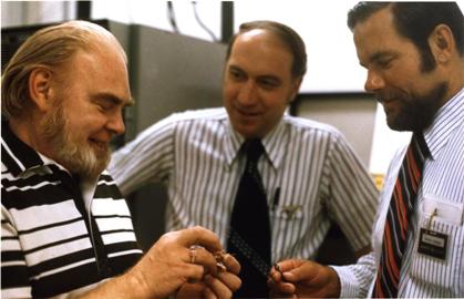 Bill [with the blonde beard] explains the passive connection device to Marc Shoquist and Ralph Kerler. [photo from Marc Shoquist]