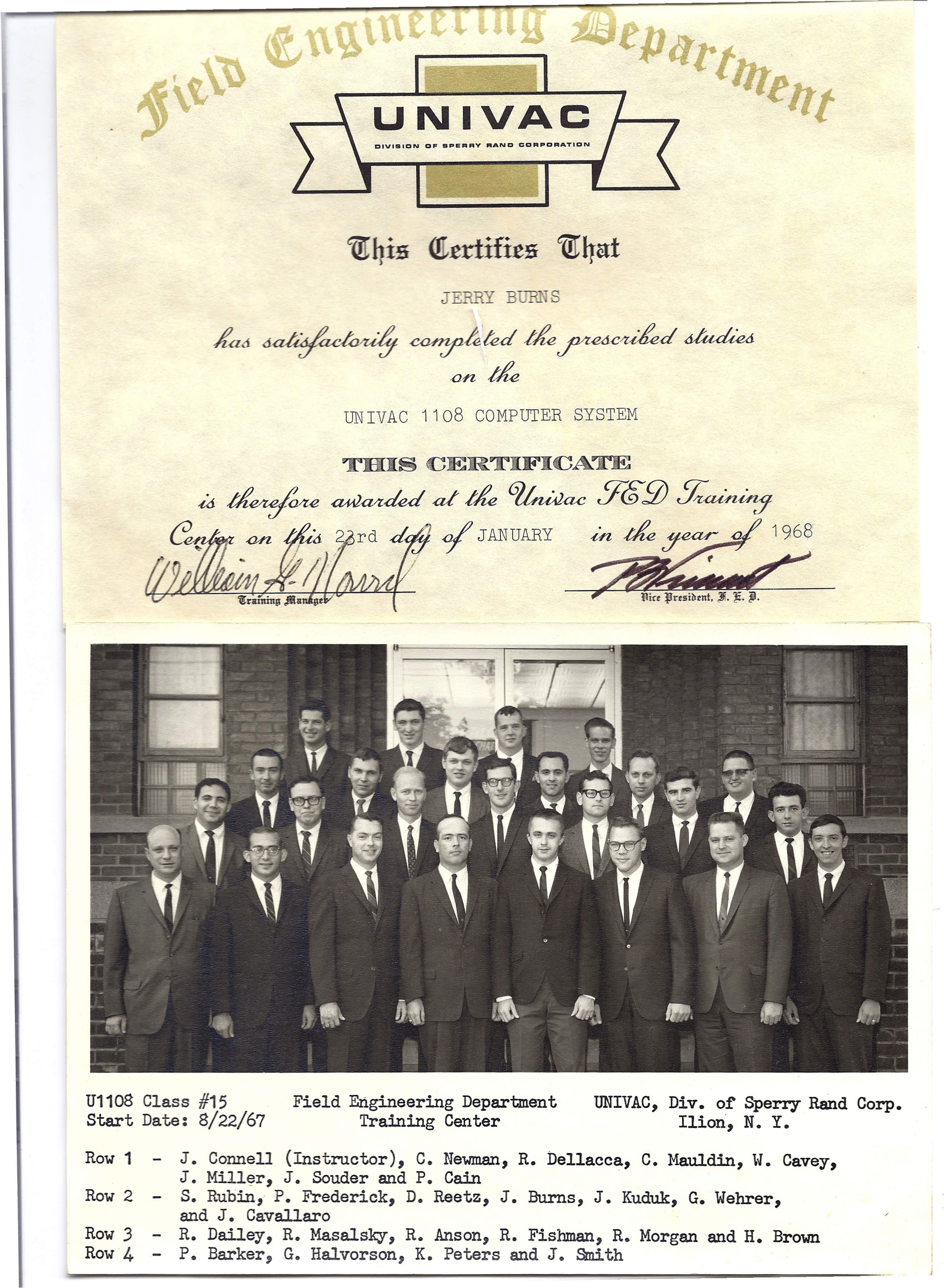 This training certificate scan of Jerry Burns completing the UNIVAC 1108 COMPUTER SYSTEM Field Engineering training